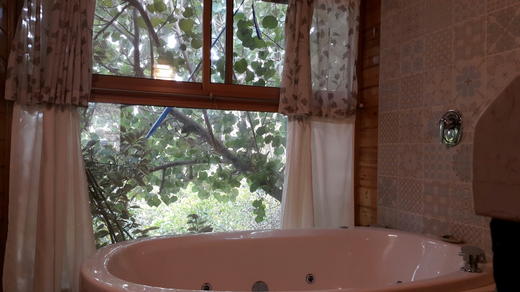 ג'קוזי זוגי שקוע ברצפת העץ של חדר האמבטיה ובו חלון גדול הפונה אל הגינה.