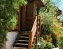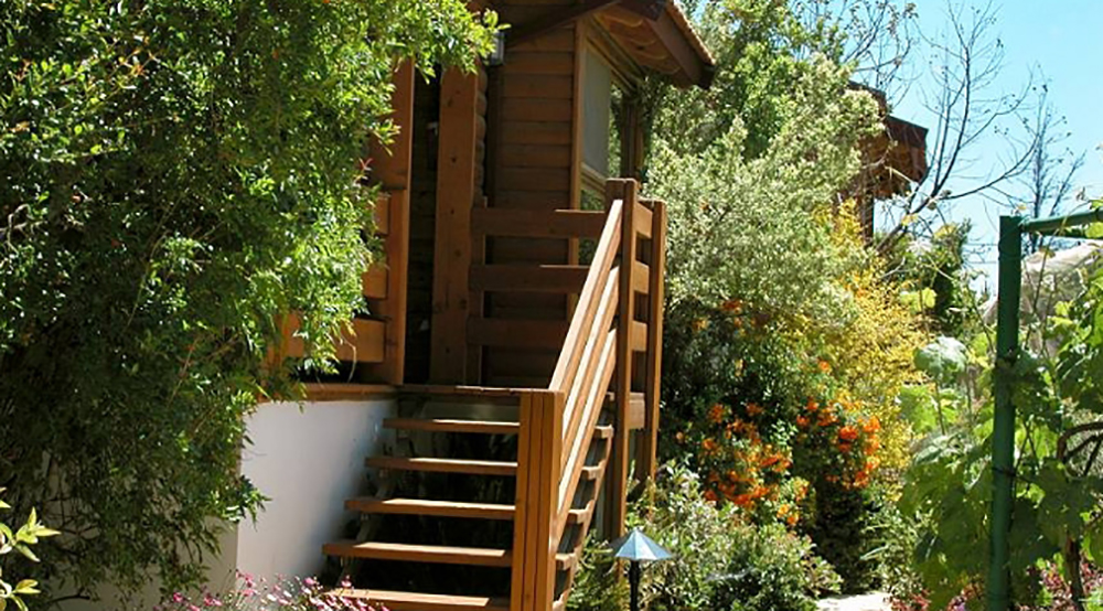 שביל אבנים מוליך אל הבקתה המוקפת בגן מרהיב ועצי בוסתן, הסוככים על הצועד בשביל.