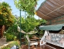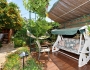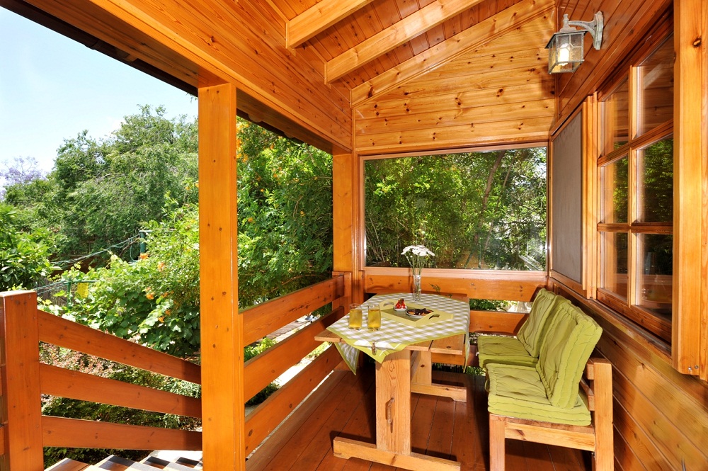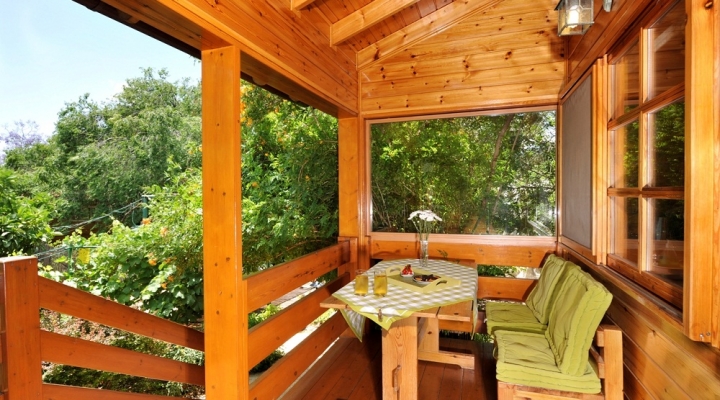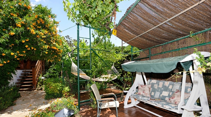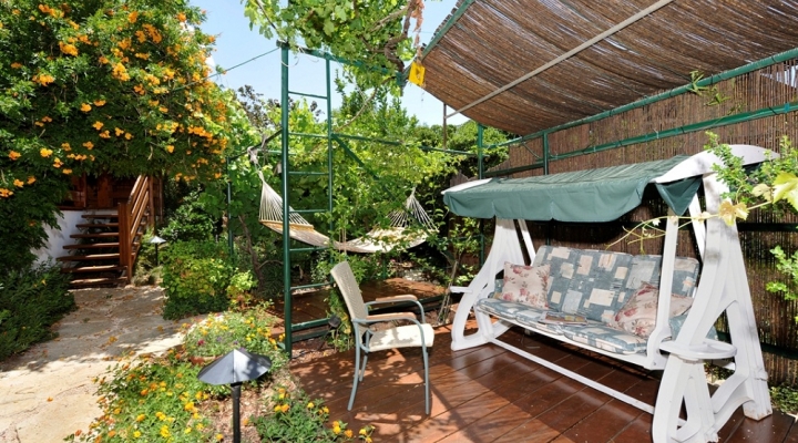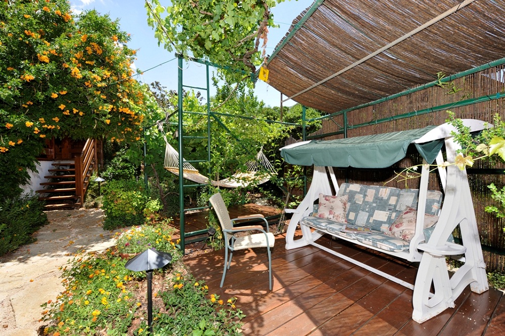 לבקתה מרפסת ופינת ישיבה עם ערסל בחצר, ונדנדת גן.